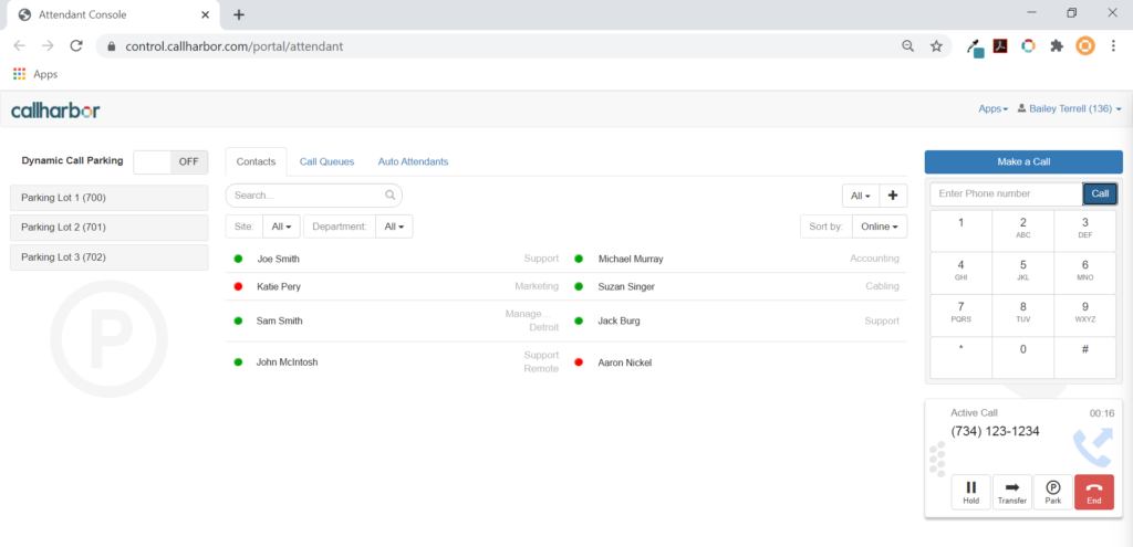 When you have an active call, you can easily drag and drop it to another extension to transfer the call. You can also drag and drop the call into a parking lot, where the call will sit until someone picks it up by dialing the parking lot extension. The color of the circle next to a user’s name indicates their availability status. A red circle indicates that user is currently on a phone call. A green circle indicates they are available for a call. If the circle is blank, the user is offline.